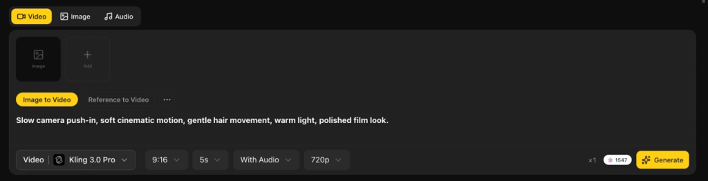 Use an image that already has a strong subject. Keep the first motion prompt short. Focus on movement, camera feel, and mood instead of describing the whole picture again. If you want a more premium visual finish, Veo is a reasonable option to try inside this workflow.